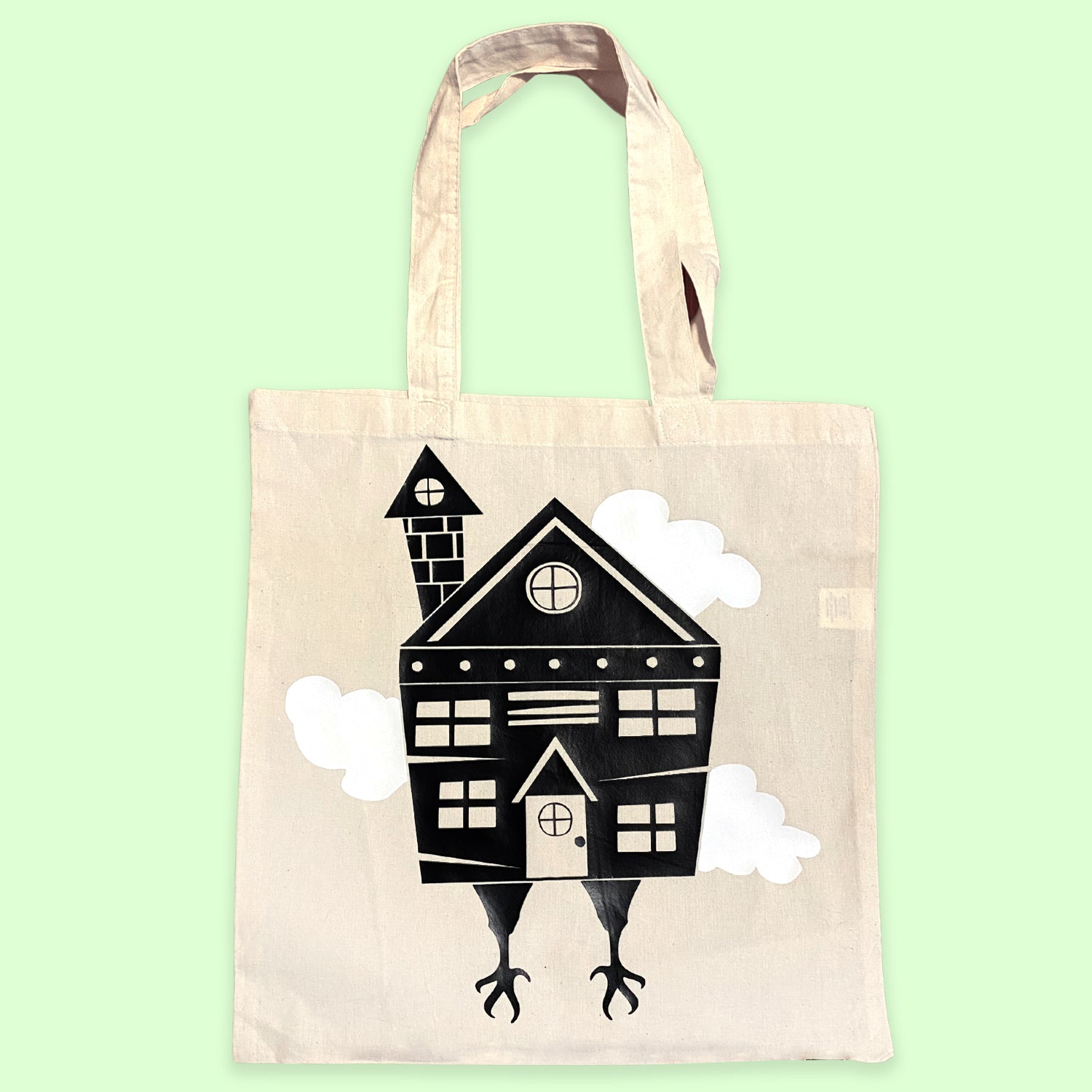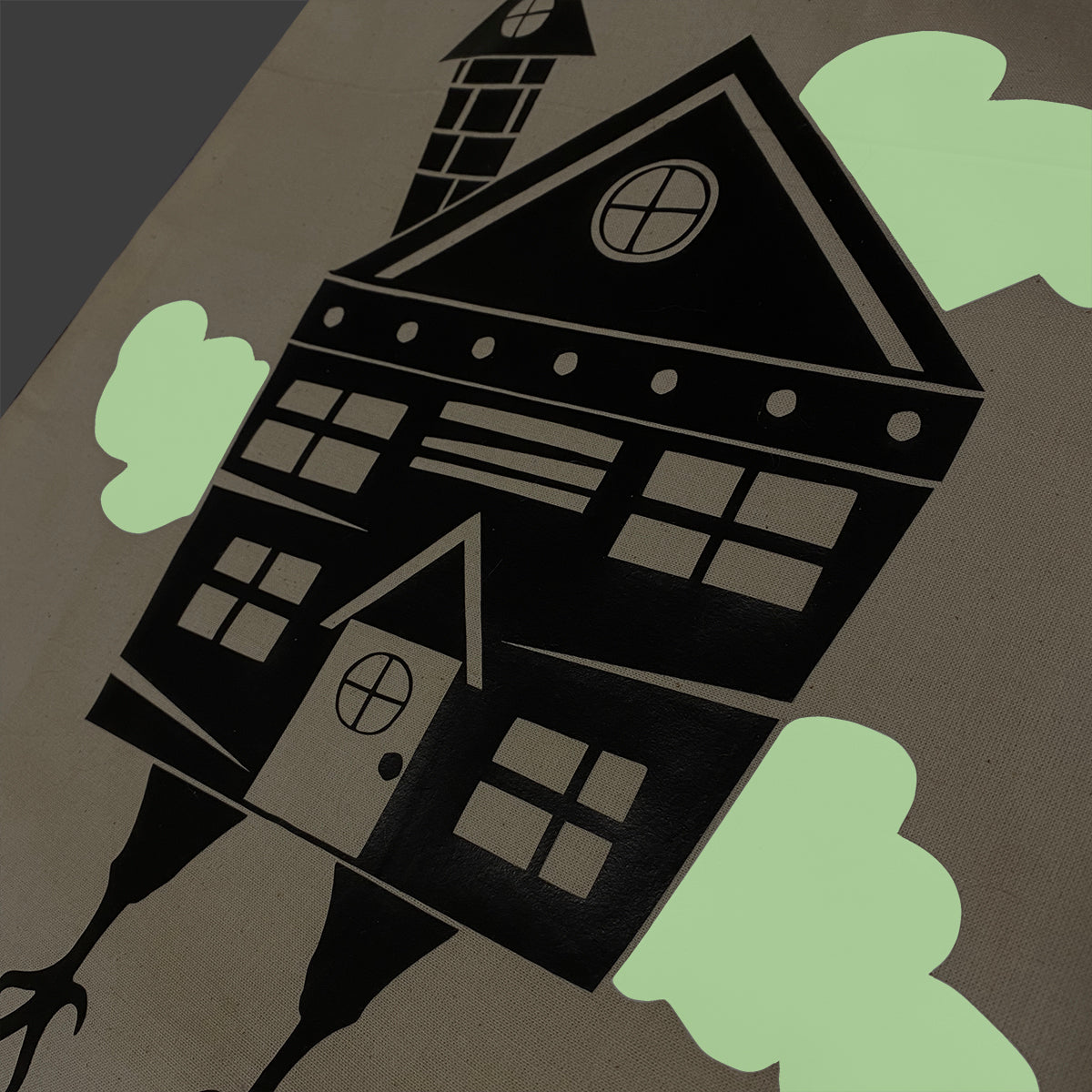 Visit Baba Yaga if you dare! This natural colored tote features a spooky black house on chicken legs with mysterious glow-in-the-dark clouds surrounding it.