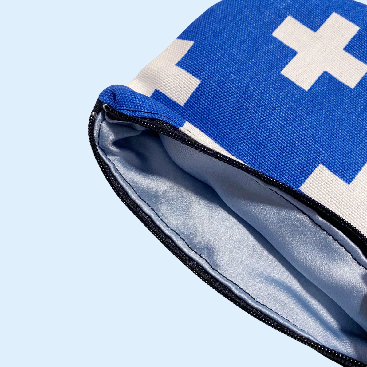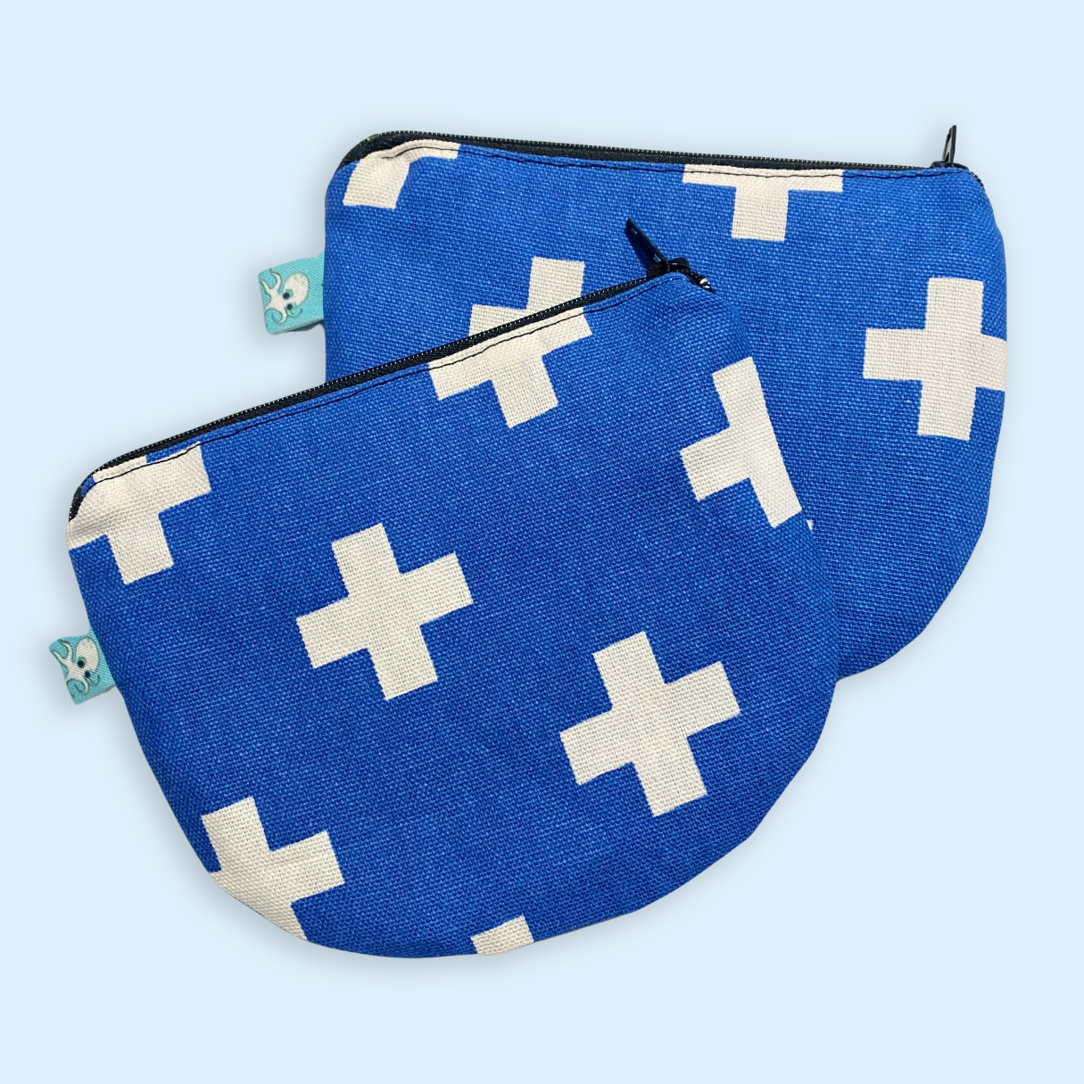 White plus signs on a bold blue background make a big statement on this small pouch. Great as a change purse, sewing kit or to hold other small necessities.