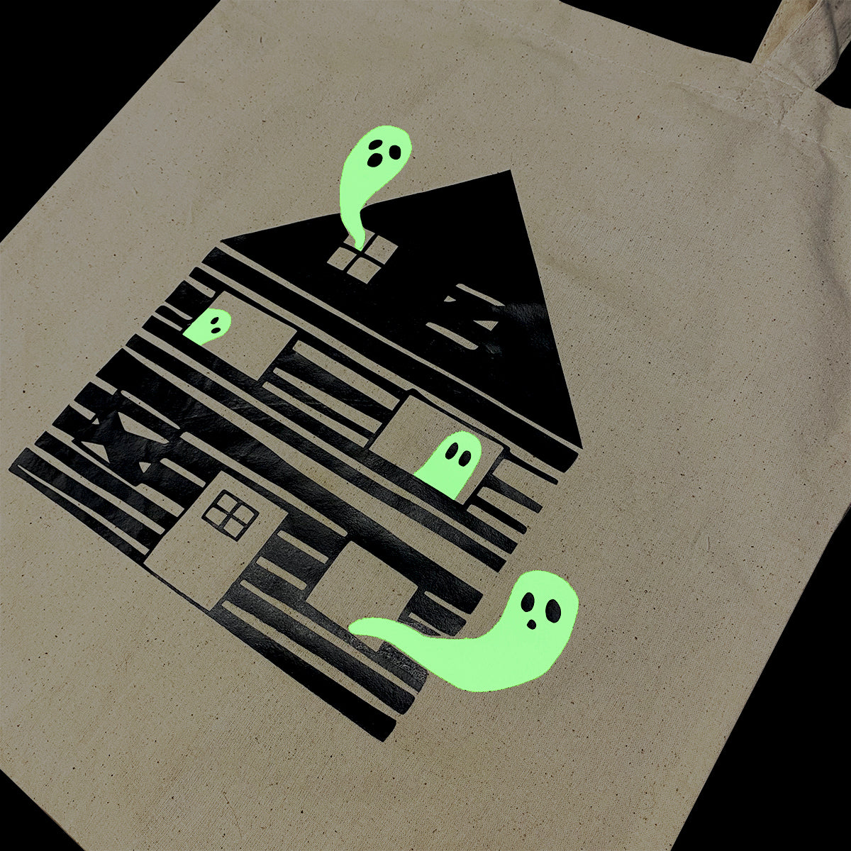 Visit a haunted house, complete with glowing ghosts! This natural colored tote features a spooky black house with glow-in-the-dark ghostly residents.