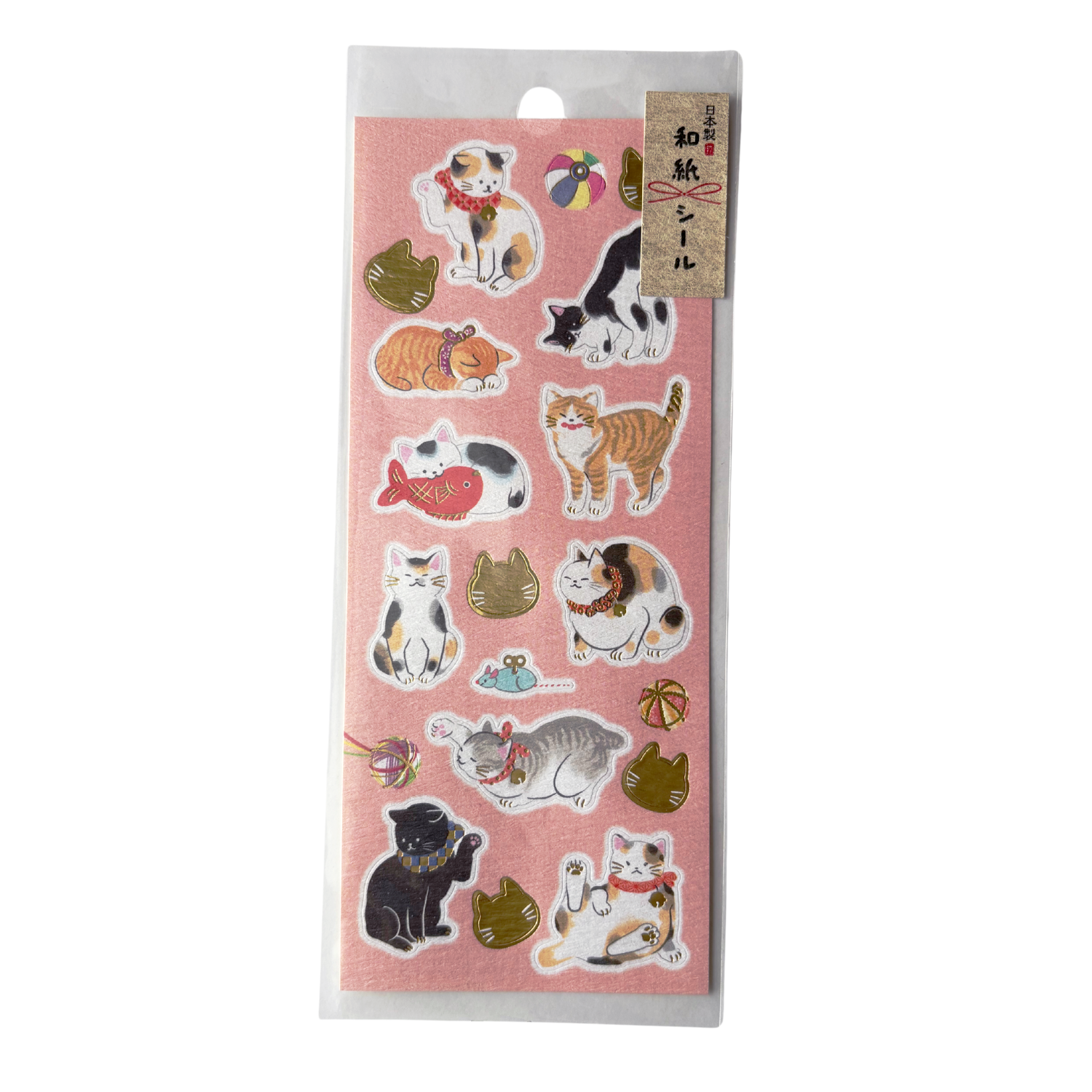 Cats relaxing and playing adorn this Japanese paper sticker sheet with gold foil accents.
